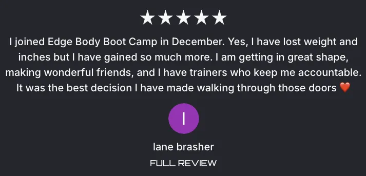 "I joined EBBC because after months and years of being unhappy I finally put myself first and made positive changes in my life The trainers and workout buddies that I have made here are by far some of the best relationships I've had. The workouts are challenging but empowering! Stress, anxiety, and all the problems of life go away when I walk through the door! Since I began my weight loss journey I've lost 75 pounds and there is no slowing down! Thanks Edge Body!"