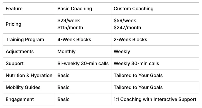 We have two levels of coaching available. Basic coaching (a program that covers standard exercises and training principles, making it accessible and straightforward for someone looking to get started). Custom coaching (tailored to your individual needs, goals, fitness level, and preferences.) Check out the table below to see how the two compare and which level is right for you!